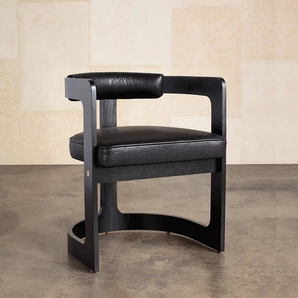 The clean, architectural lines and casual sensibility of the Zuma Dining Chair make this dining option a modern classic. The bent Oak frame with its sweeping curves comes in a natural finish with thoughtful brass detailing. The tightly upholstered seat back wraps trimly around the frame and the boxed seat has a self-welt detail. These perfectly proportioned chairs are crafted in the Kelly Wearstler Los Angeles workshop and are available in a curated selection of leathers and fabrics.