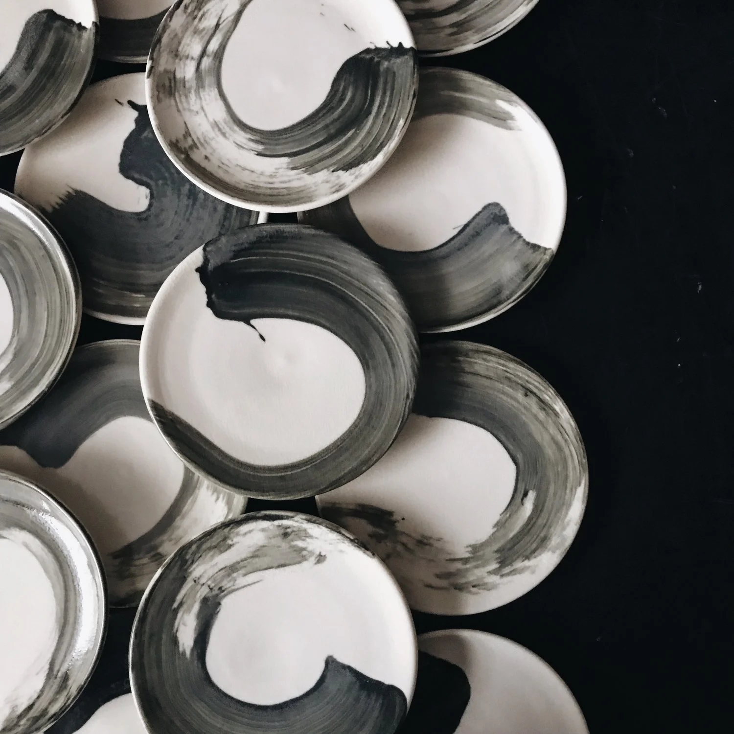 Wheel thrown porcelain with a big, bold brushstroke to decorate the surface, this piece is a show stopping canvas for any culinary creation. In one confident movement, a black brushstroke is hand-painted onto the surface using a Japanese sheep hair brush. These plates make ephemeral moments last forever.